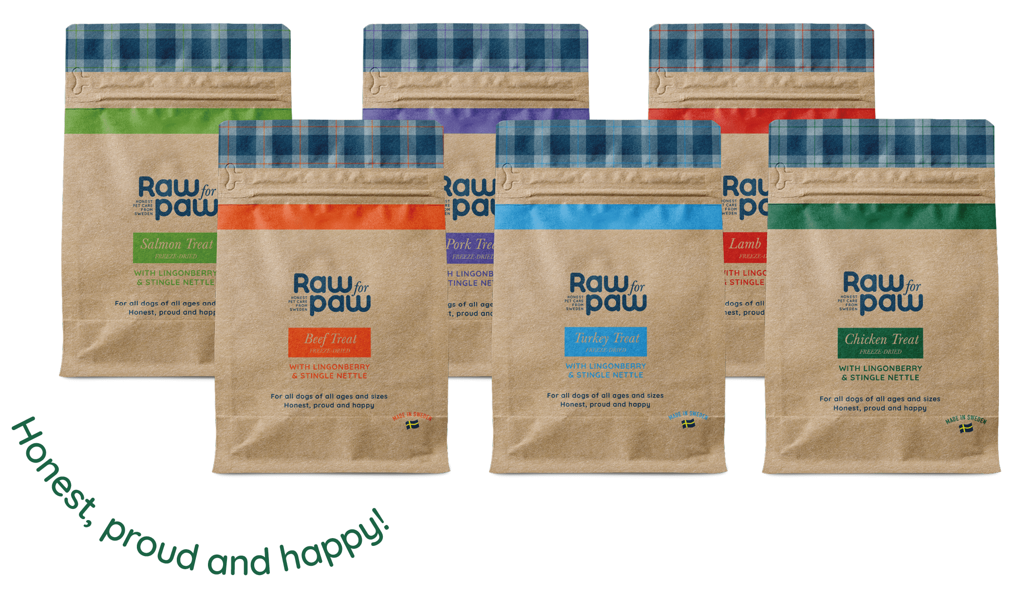 Raw for Paw Treats är frystorkade bitar av 97% kött samt 3% lingon och nässla. Dessa välsmakande hundgodisar torkar vi själva på vår fabrik i Småland. Självklart så kommer allt kött från djur som har levt det goda livet på våra nordiska gårdar.
