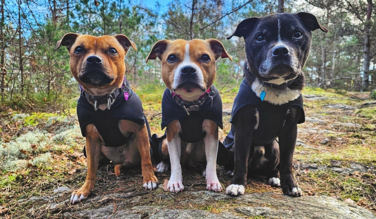Efter den något stökiga erfarenheten med sin första omplaceringshund var Ida osäker på om hon ville ta emot en ny. Men så en dag dök Burtons ansikte upp i Facebook-flödet från en staffe-sida. Efter att ha gjort sin research hos uppfödaren och nuvarande ägaren bestämde hon sig för att välkomna Burton in i sitt hem. Då var han 7.5 år och skulle avlivas om han inte fick ett nytt hem. Idag har han hunnit bli 15 år och fått mer fyrbent sällskap i form av Cleo på 7 år och Raya som är 2 år.